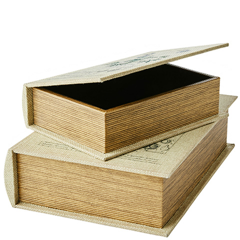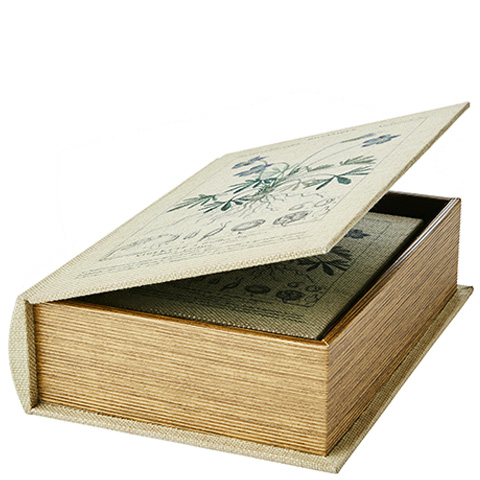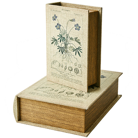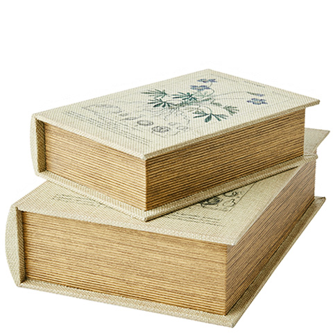 "Brooke" Dekorativa förvaringsboxar som ser ut som gamla böcker. Den linneklädda ytan har ett gammaldags tryck med botansikt motiv. Brooke levereras som 2 böcker i ett set och den mindre boken får plats i den större