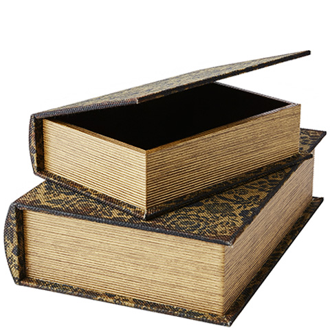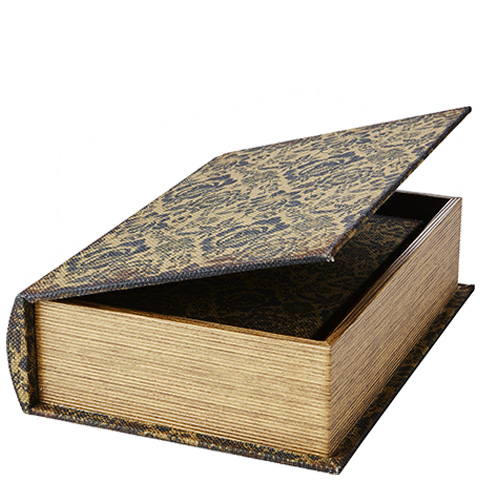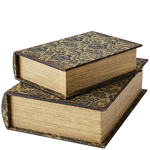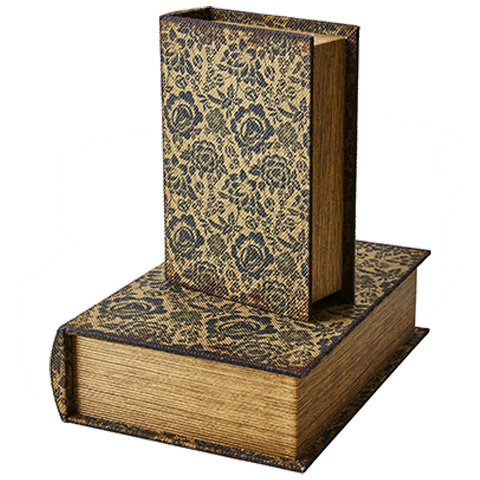 "Brooke" Dekorativa förvaringsboxar som ser ut som gamla böcker. Den linneklädda ytan har ett gammaldags tryck med svarta blommor och naturfärgad bakgrund med en guldig känsla då linne naturligt har en viss glans. Brooke levereras som 2 böcker i ett set och den mindre boken får plats i den större