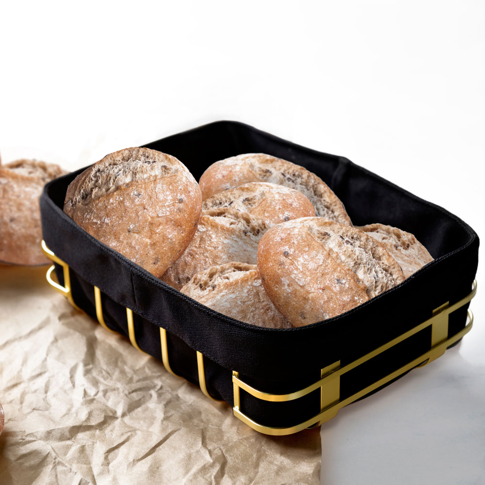 Servera nybakat bröd i dessa snygga brödkorgar. Textilväskan är avtagbar och tillverkad av 100% bomull. Stålkorg belagd med en matt, guldfärgad yta. Textilpåsen kan rengöras i tvättmaskin på ett skonsamt 30°C-program. Tvätta med mörka färger. Torktumla ej. Stålkorgen kan rengöras med en fuktig trasa.