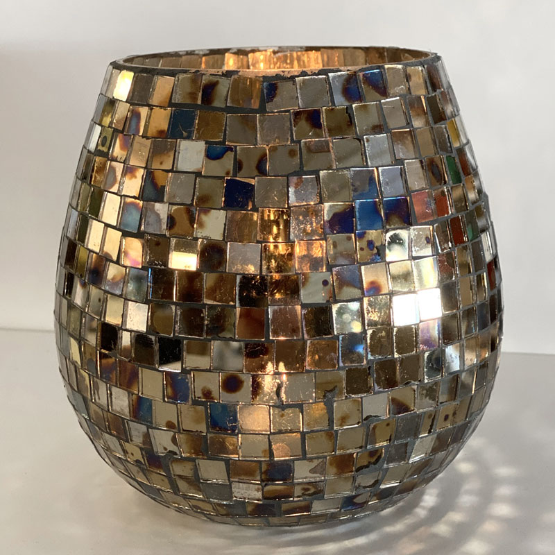 "Daria" Vacker glaslykta, värmeljushåller från Holmen. Utsidan beklädd med glas/spegelbitar med oljig färgmix från silver till beige, brun och blå.