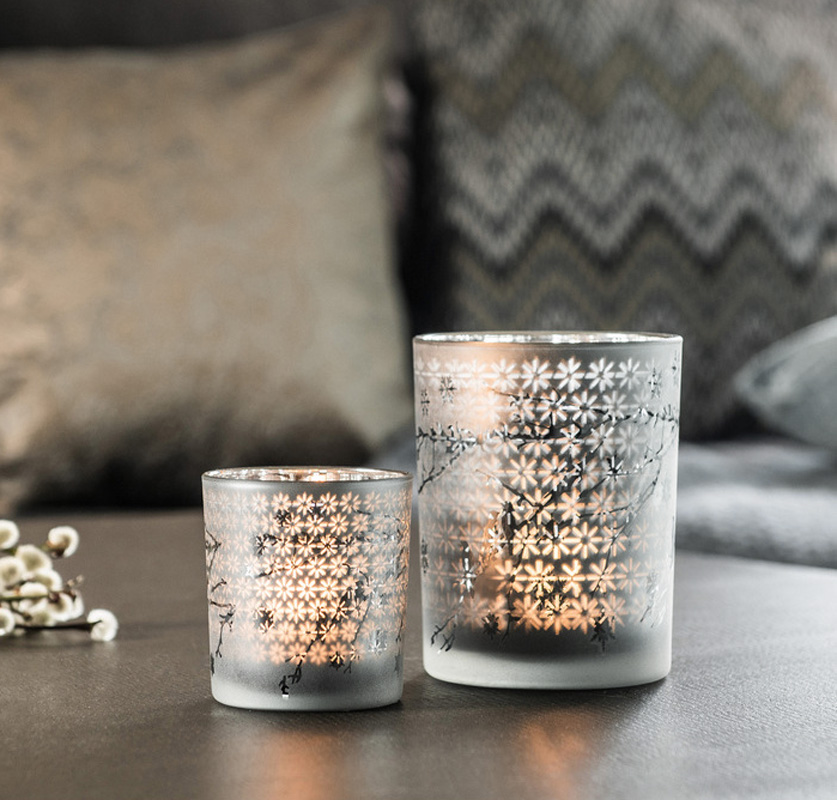 Grå Ljuslykta i glas med dubbla mönster - 8 cm hög