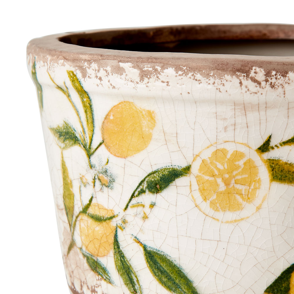 "Lemona" vacker serie med krukor, vaser och urnor från Affari. Vackert antikbehandlad kruka i rund bred form och med ett härligt gult och grönt mönster på benvit botten.