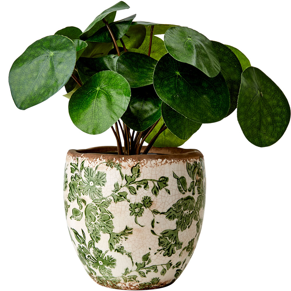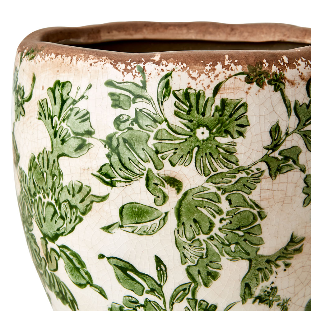 "Victoria" vacker serie med krukor, vaser och urnor från Affari. Vacker kanna, tillbringare som dekoration eller vas med antikbehandlad finish. Jättefint grönt mönster på benvit botten.