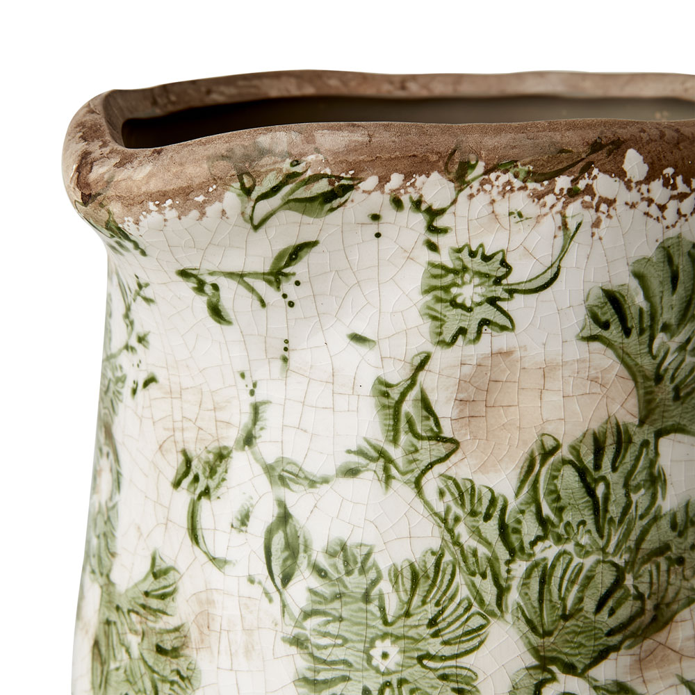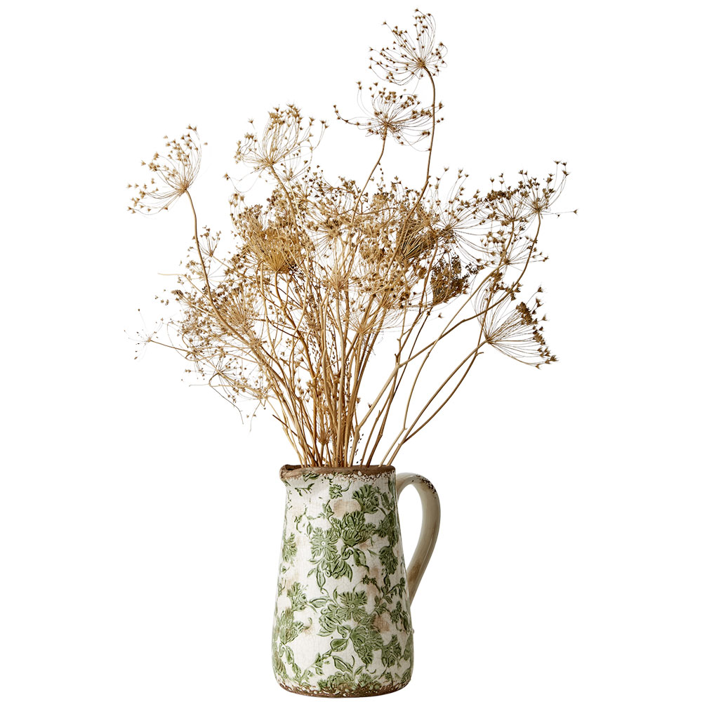 "Victoria" vacker serie med krukor, vaser och urnor från Affari.Vacker kanna, tillbringare som dekoration eller vas med antikbehandlad finish. Jättefint grönt mönster på benvit botten.