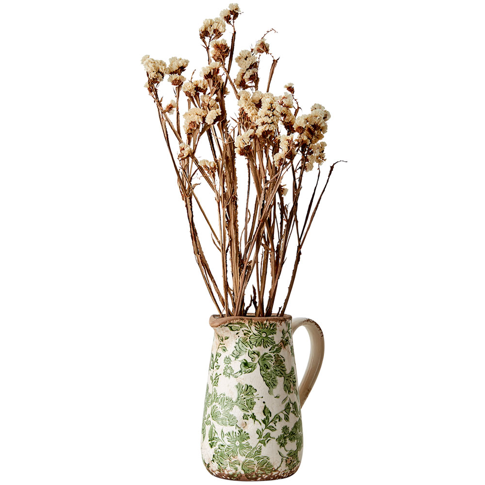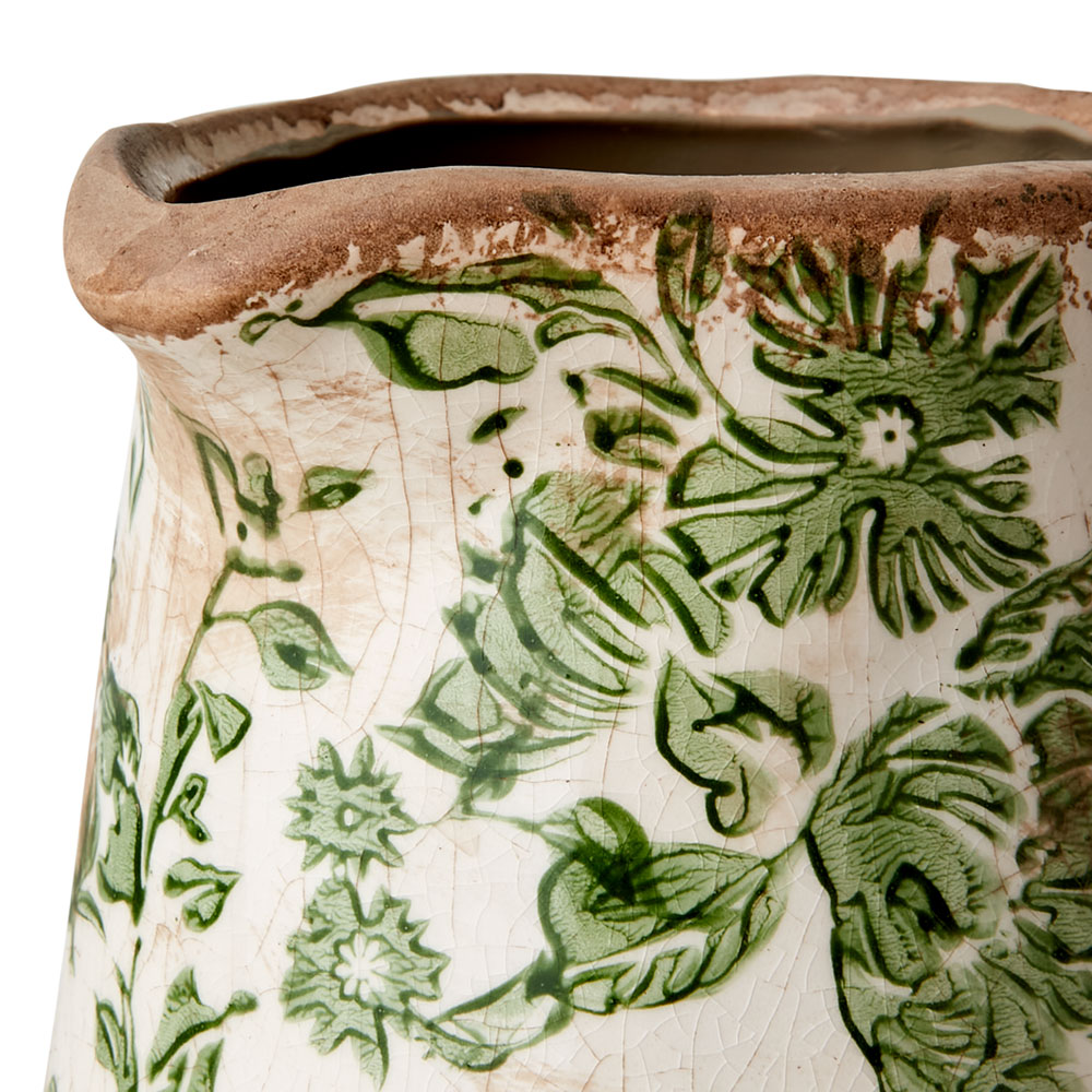 "Victoria" vacker serie med krukor, vaser och urnor från Affari.Vacker kanna, tillbringare som dekoration eller vas med antikbehandlad finish. Jättefint grönt mönster på benvit botten.