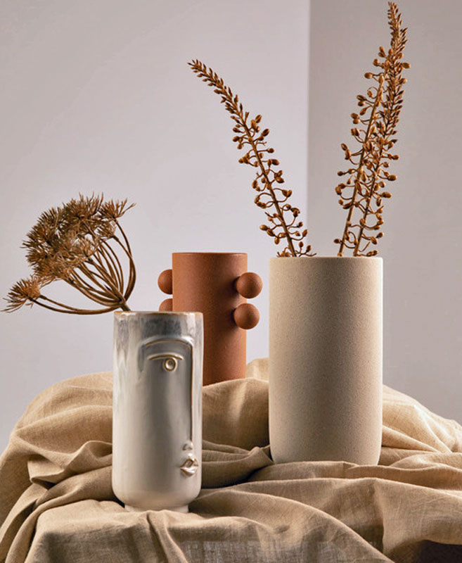 Vas Dali i blankt glaserat stengods. Vit med mönster i gråblå och beige - Design by Holmen
