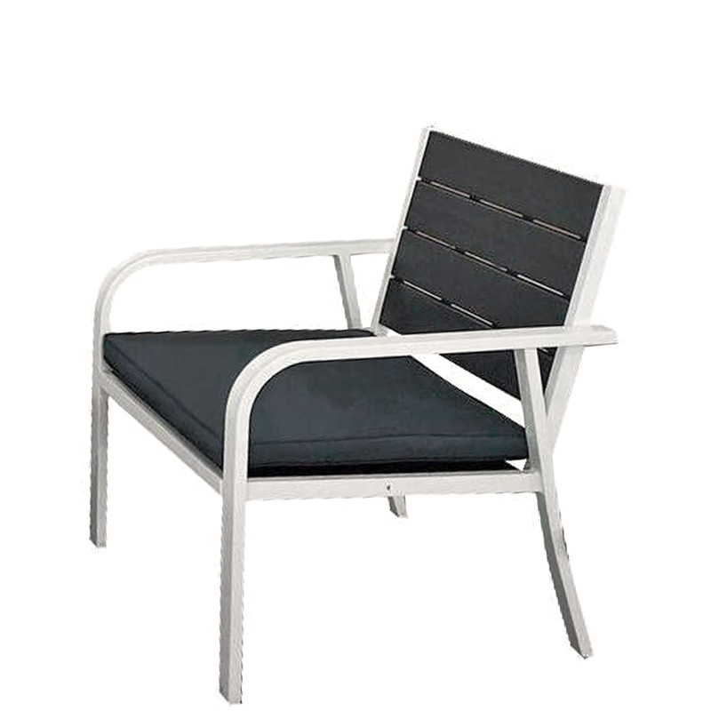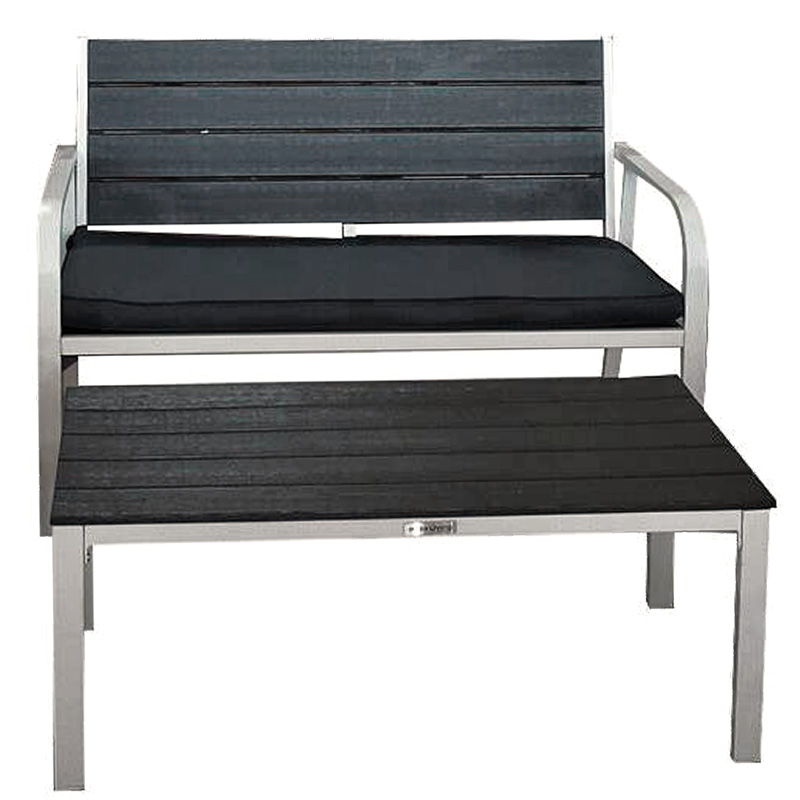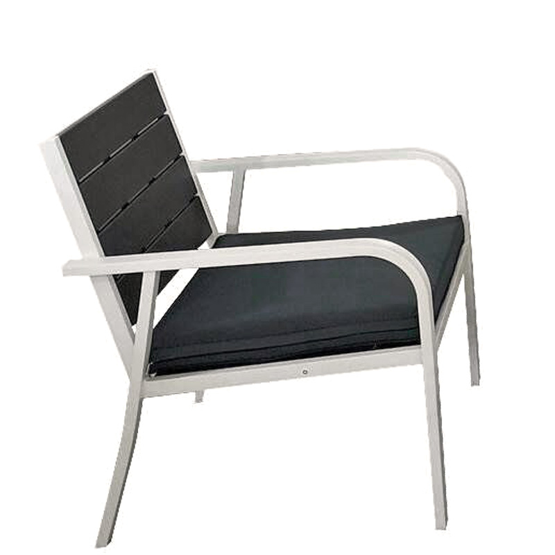 Ram i vit pulverlackad aluminium med svarta, mörkgrå HDPE plastplattor med träprofil. Mörkgrå sittdynor ingår med yttertyg i 200gsm Polyester.