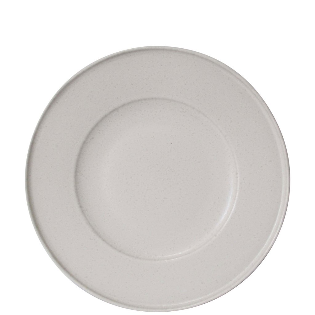 Vackert vit assiett i stengods med en finish fylld med små halvglansiga fläcker i ljus, ljus beige/offwhite.