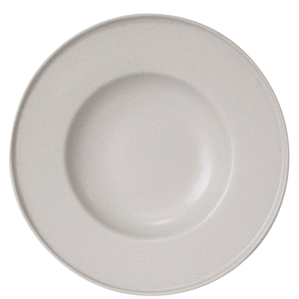 Vackert vit djup tallrik i stengods med en finish fylld med små halvglansiga fläcker i ljus, ljus beige/offwhite.