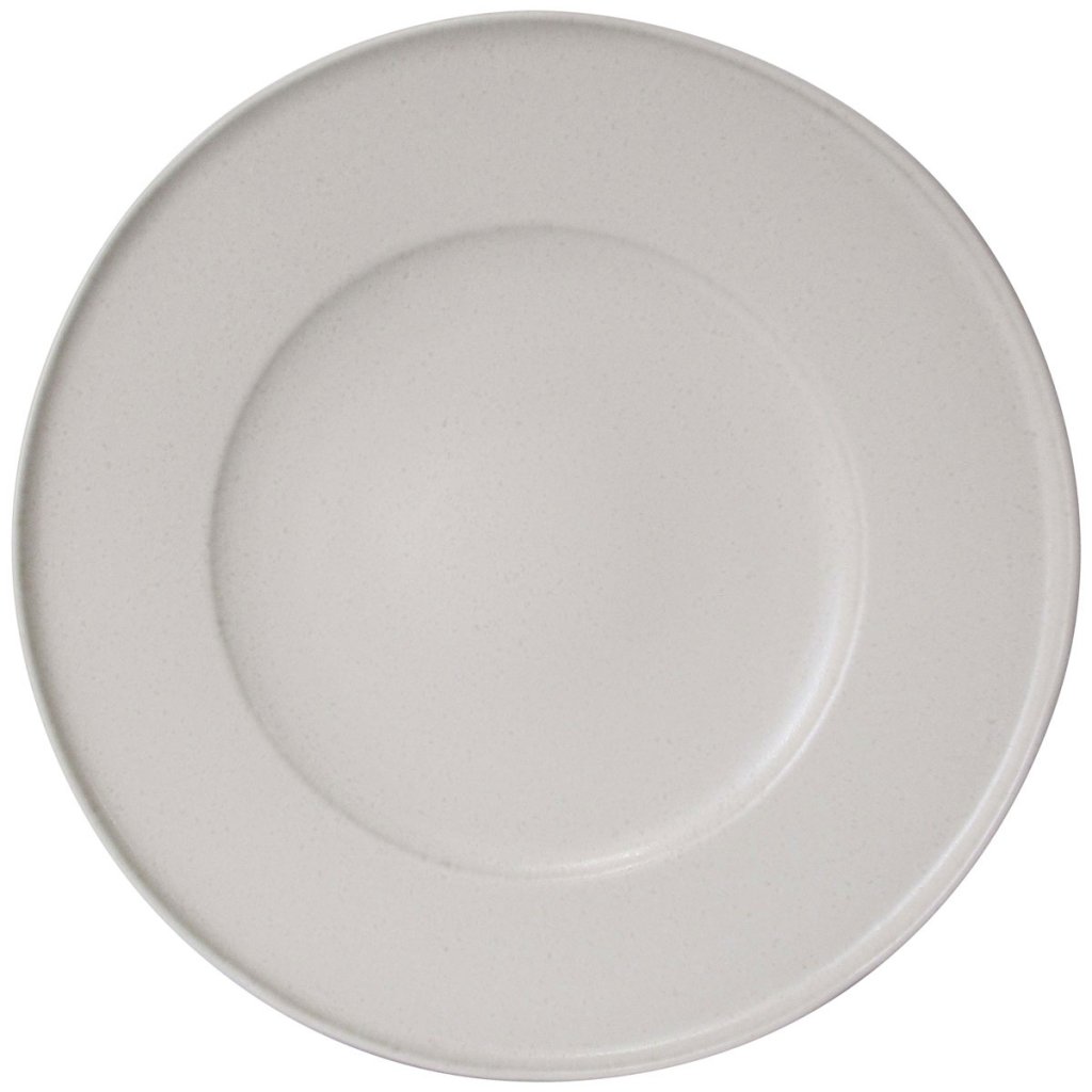 Vackert vit tallrik i stengods med en finish fylld med små halvglansiga fläcker i ljus, ljus beige/offwhite.