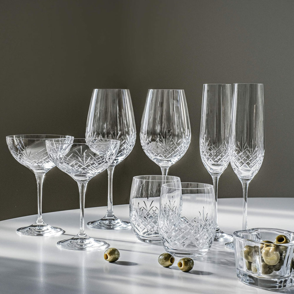 Elegant slipat blyfritt kristallglas. Glasen har hög klarhet i glasmassan och är facetterade i ett klassiskt ananasmönster.