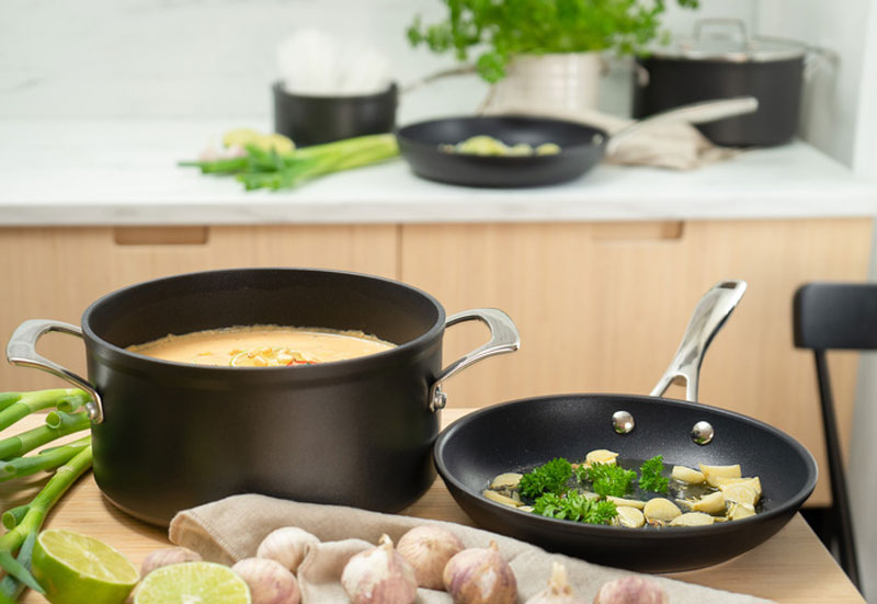 Black Line tillverkas i belagd aluminium och rostfritt stål och hela serien har riktigt tjock botten för en jämn värmefördelning och en helt PFAS-fri keramisk G7-Beläggning