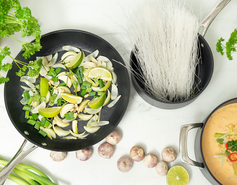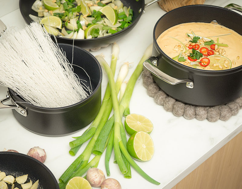 Black Line tillverkas i belagd aluminium och rostfritt stål och hela serien har riktigt tjock botten för en jämn värmefördelning och en helt PFAS-fri keramisk G7-Beläggning