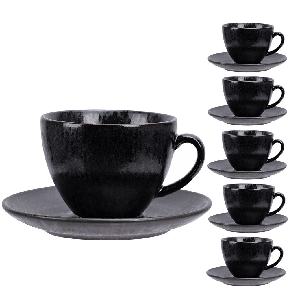 Rustika svarta Kaffekoppar med fat - 6-Pack