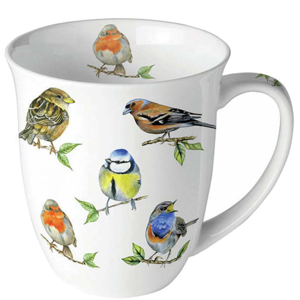 Konstnärligt vacker vit mugg i fint benporslin - Motiv med olika fåglar på vit bakgrund. Tillverkas av Ambiente kända för sina otroligt vackra designmotiv.