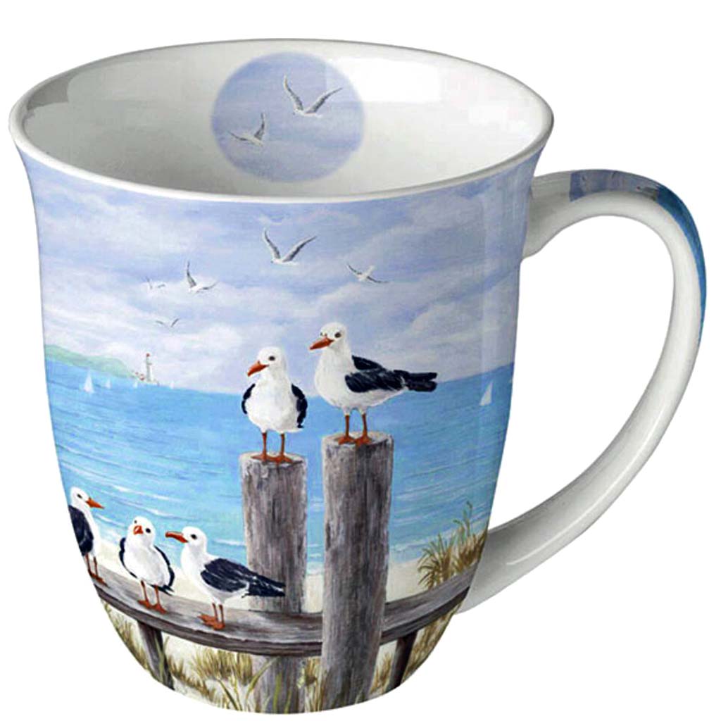 Konstnärligt vacker mugg i fint benporslin - Motiv med fiskmås på brygga mot vackert blått hav och himmel. Tillverkas av Ambiente kända för sina otroligt vackra designmotiv
