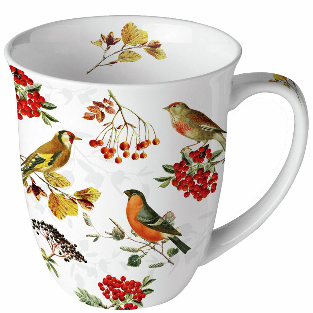 Konstnärligt vacker mugg i fint benporslin - Vackert höst- & vintermotiv med olika fågelarter på olika bärkvistar. Tillverkas av Ambiente kända för sina otroligt vackra designmotiv.