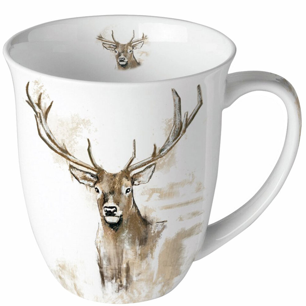 Konstnärligt vacker mugg i fint benporslin - Vintermotiv, Julmotiv med ren med stora horn på vit mugg. Tillverkas av Ambiente kända för sina otroligt vackra designmotiv.
