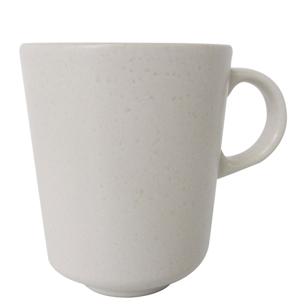 Vackert vit mugg i stengods med en finish fylld med små halvglansiga fläcker i ljus, ljus beige/offwhite.