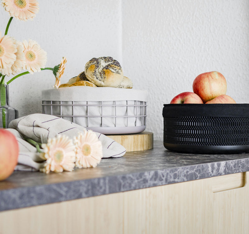 Textilväskan är avtagbar och tillverkad av 100% bomull. Stålkorg belagd med en matt varmgrå yta. Textilpåsen i naturfärgad ljus beige kan rengöras i tvättmaskin på ett skonsamt 30°C-program. Tvätta med mörka färger. Torktumla ej. Stålkorgen kan rengöras med en fuktig trasa.