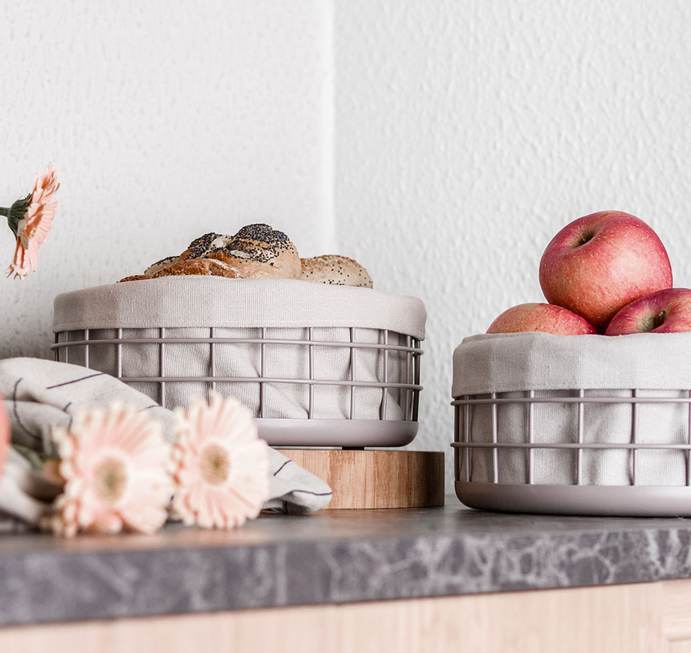 Textilväskan är avtagbar och tillverkad av 100% bomull. Stålkorg belagd med en matt varmgrå yta. Textilpåsen i naturfärgad ljus beige kan rengöras i tvättmaskin på ett skonsamt 30°C-program. Tvätta med mörka färger. Torktumla ej. Stålkorgen kan rengöras med en fuktig trasa.