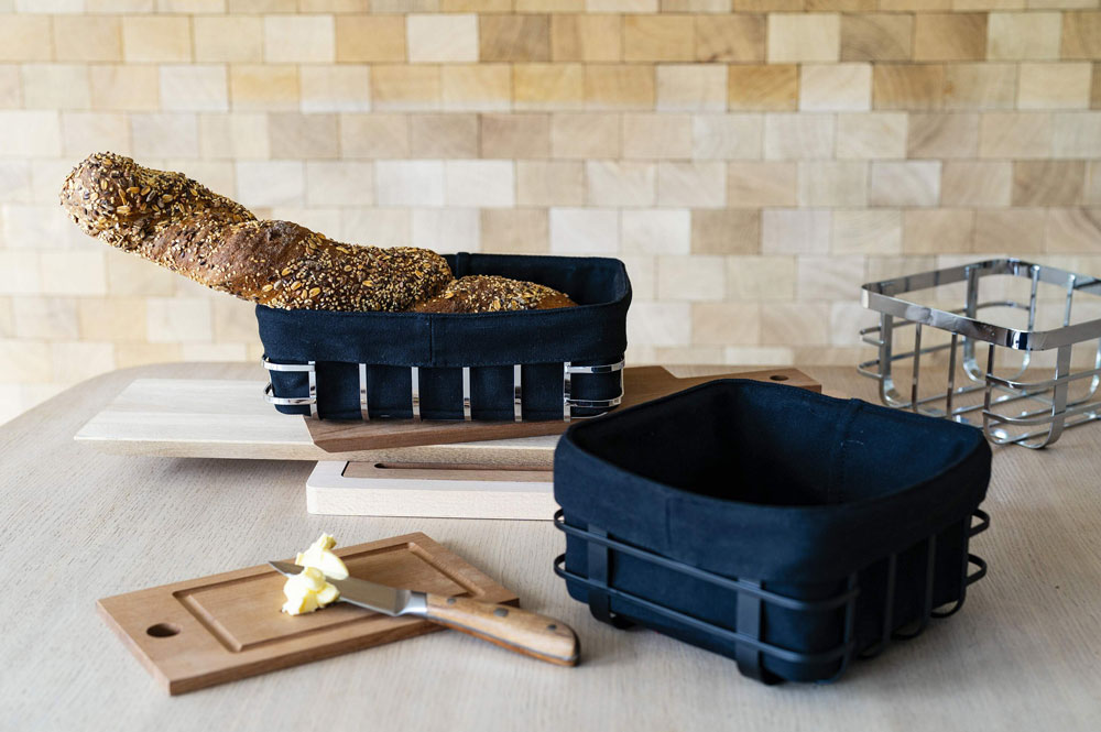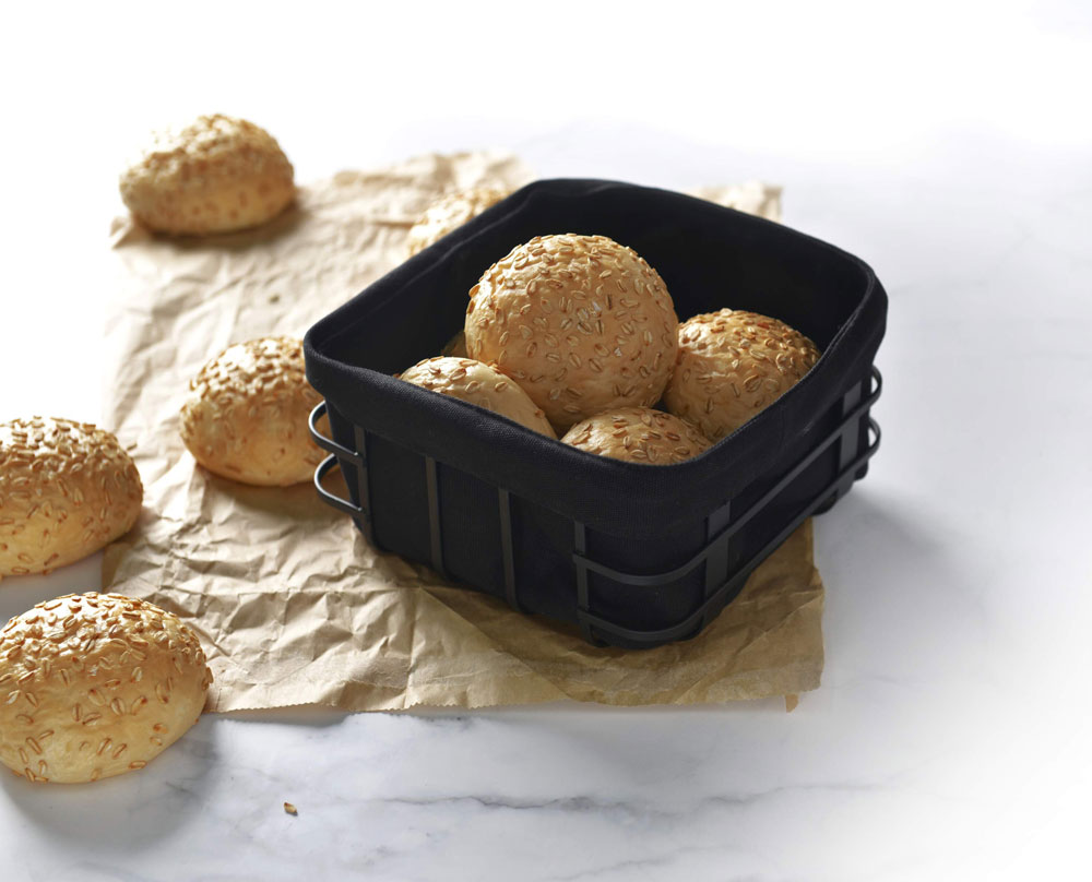 (OBS! Byter namn till "Lundi" )Servera nybakat bröd i dessa snygga brödkorgar. Textilväskan är avtagbar och tillverkad av 100% bomull. Stålkorg belagd med en matt svart yta. Textilpåsen kan rengöras i tvättmaskin på ett skonsamt 30°C-program. Tvätta med mörka färger. Torktumla ej. Stålkorgen kan rengöras med en fuktig trasa.