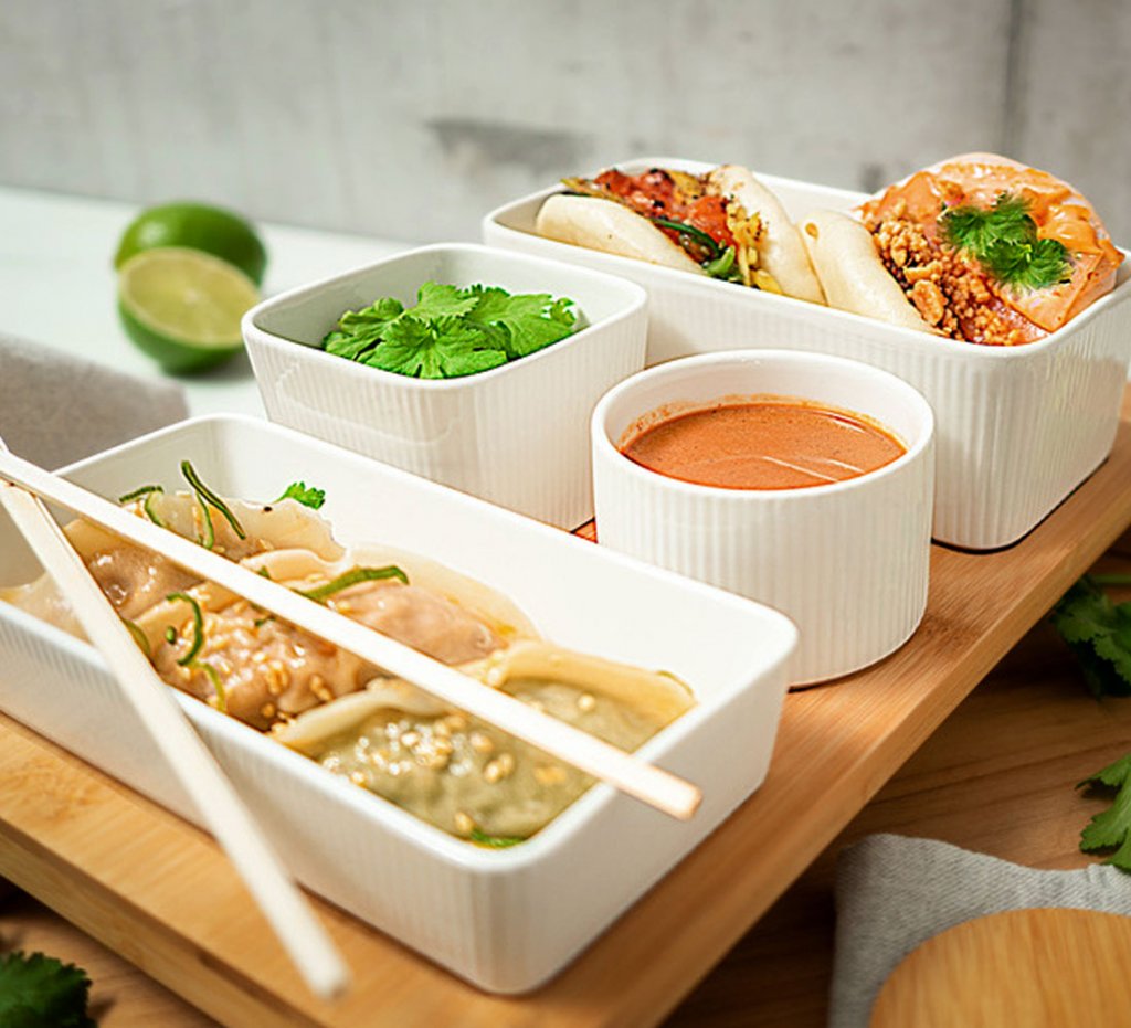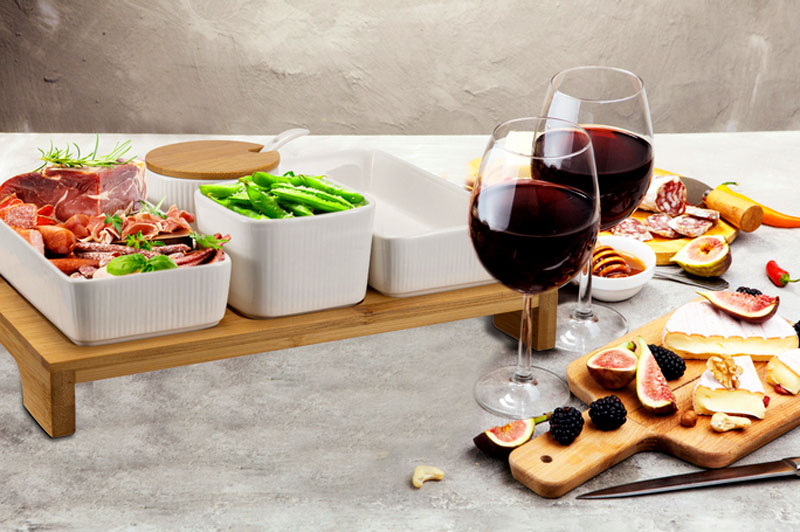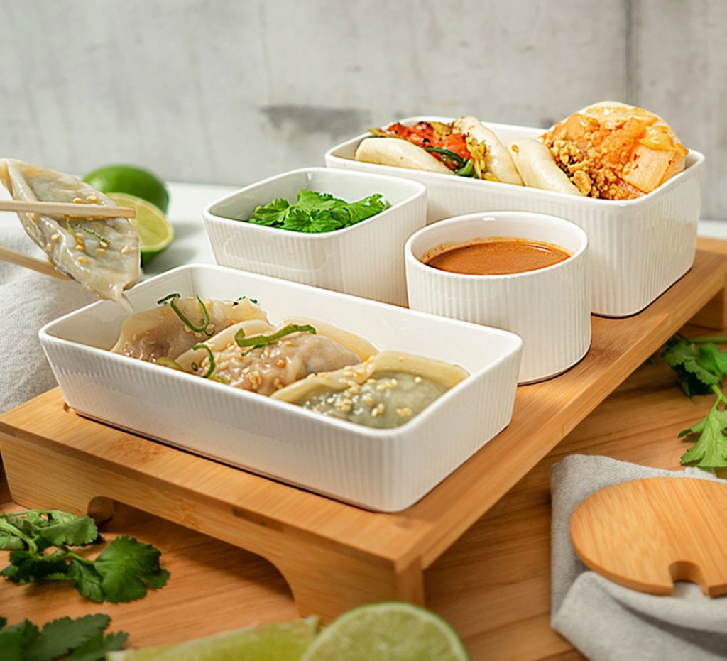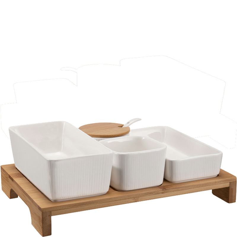 Trevligt och dekorativt serveringsset med 4 skålar i porslin och bricka i bambuträ. En av skålarna har ett bambulock med utskärning för att hålla den medföljande lilla vita skeden på plats