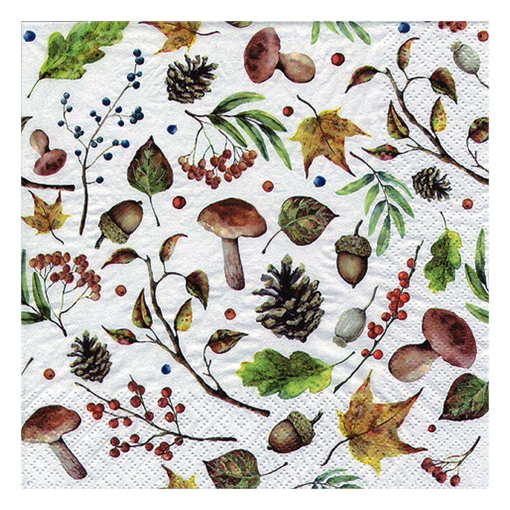 Pappersservett i lunchservett-storlek med vackert motiv svamp, kottar och kvistar på vit bakgrund.
