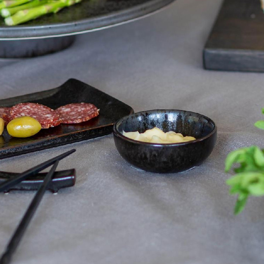 Svart liten skål, fat till dip, konfektyr eller annan delikatess. Vackert reaktiv glasering och rustik finish. Ingen produkt blir exakt likadan med denna typ av glasyr. Ø8 cm.