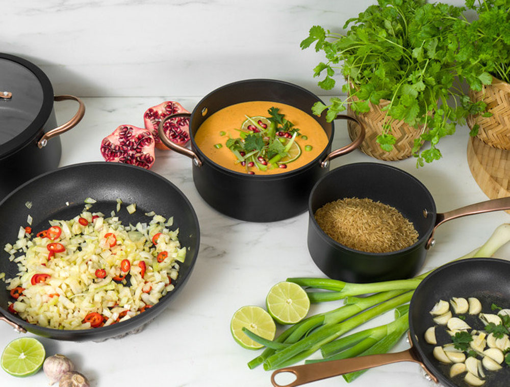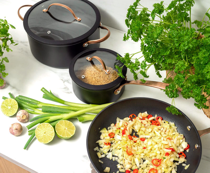 Black Copper tillverkas i läckert mattsvart-belagd aluminium och kvalitetsstål där botten har en aluminiunkärna (belagd med stål på båda sidor) - som ger snabb, jämn och effektiv värmespridning. Aluminiumkärna gör att värmen leds optimalt och ger snabb uppkokning vilket sparar energi. Grytan kan användas på alla typer av hällar.