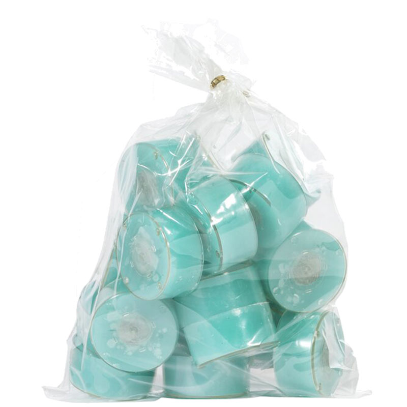Färgade värmeljus i en vacker ljus turkos färg i en genomskinlig plastkopp tillverkad i eldfast polycarbonate.