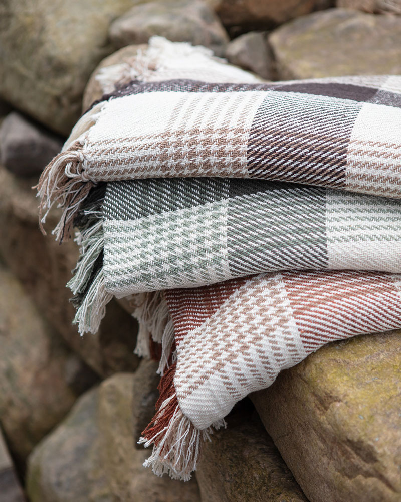 "Anna" Härligt mysiga filtar i återvunnen bomull. Rutigt mönster och en gräddvit, elfenbensfärgadbotten med mönster i naturgrön