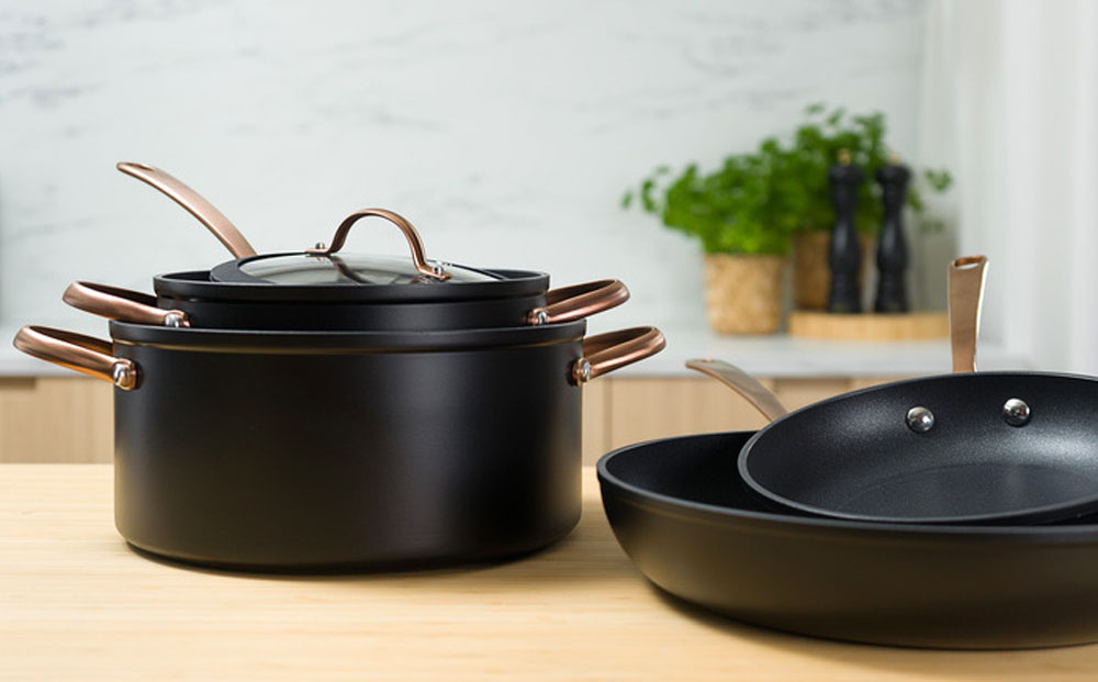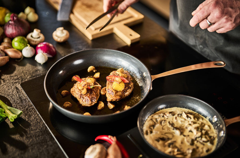 Black Copper tillverkas i läckert mattsvart-belagd aluminium och kvalitetsstål där botten har en aluminiunkärna (belagd med stål på båda sidor) - som ger snabb, jämn och effektiv värmespridning. Aluminiumkärna gör att värmen leds optimalt och ger snabb uppkokning vilket sparar energi. Stekpannan kan användas på alla typer av hällar.
