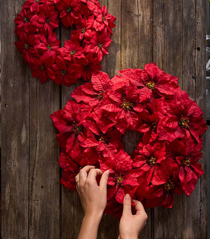 Krans eller dörrkrans med konstgjorda blommor, röda julstjärnor i ett mycket vackert utförande från Mr.Plant. Kraftfullt röda julstjärnor
