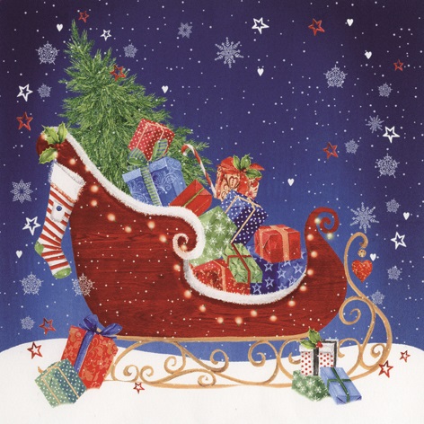 Pappersservett med fint julmotiv med släde fylld med julklappar och gran.