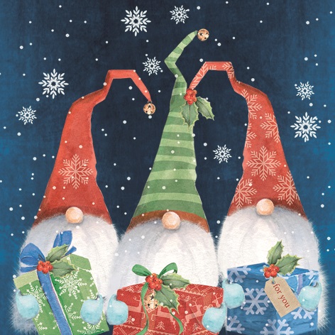 Pappersservett med fint motiv med 3 jultomtar med paket