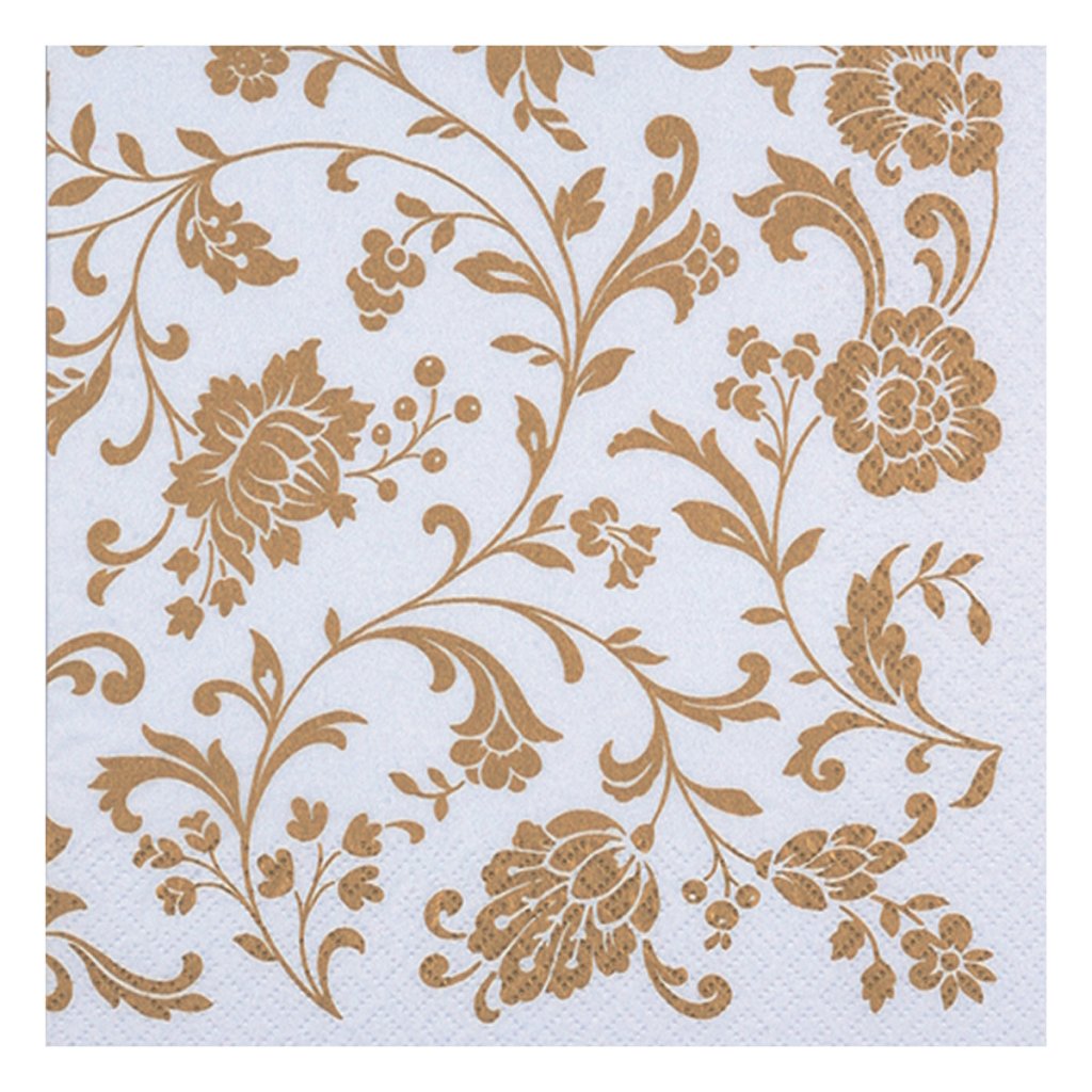 Pappersservett med guldmedaljonger på vit bakgrund.