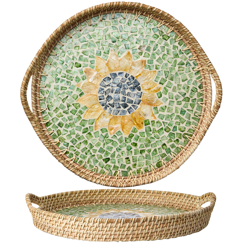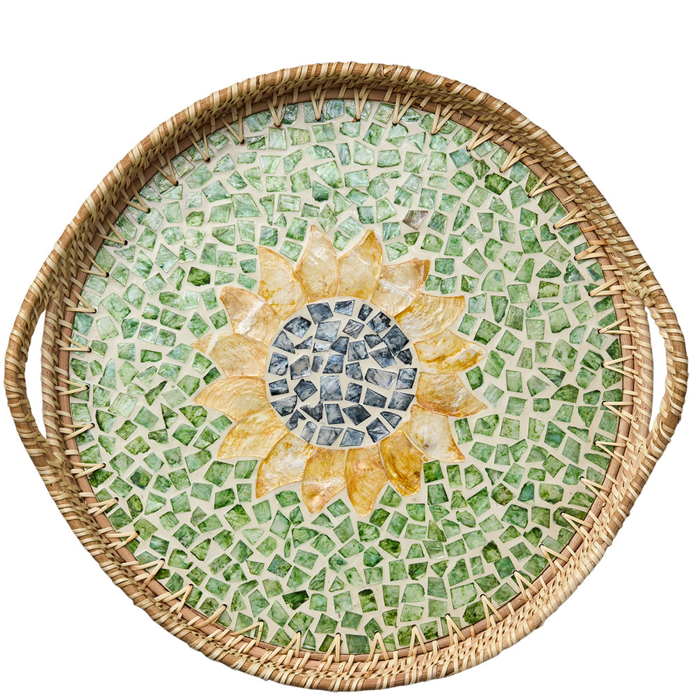 "Sunny" - Eleganta naturfärgade brickor med mönster i grönt, gult och blått. Brickan upplevs som ett vackert konstverk i sig. Brickans yta har ett omsorgsfullt lagt mönster som skapas av odlade snäckor format likt en solros. Detta ger en taktil och naturnära känsla.