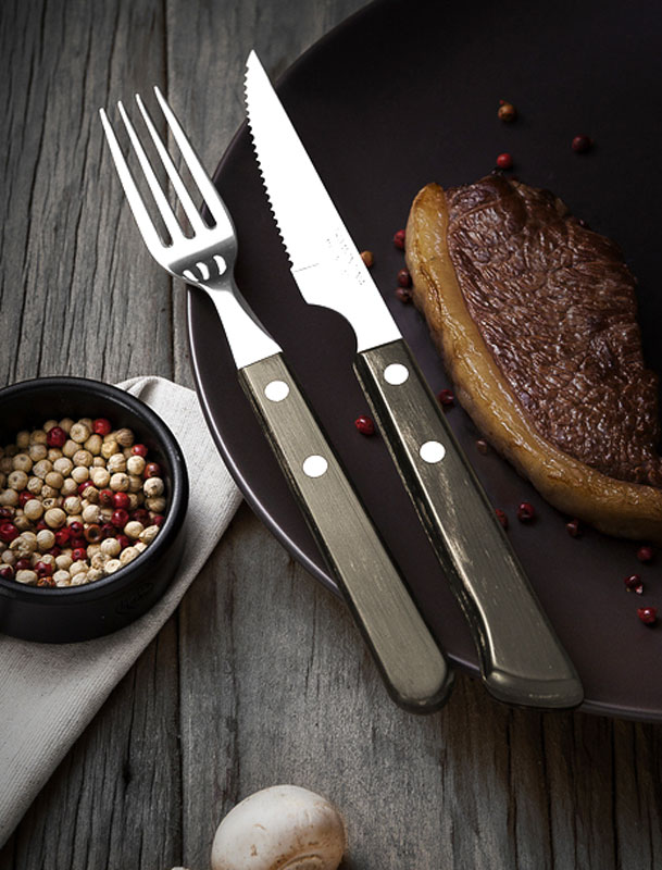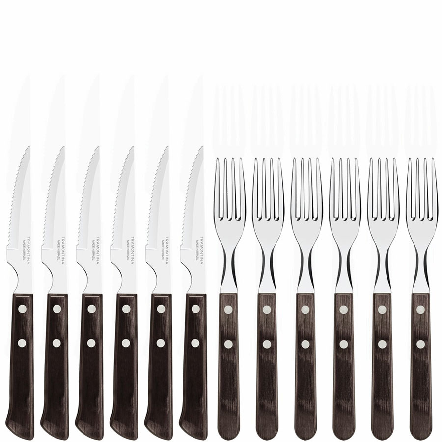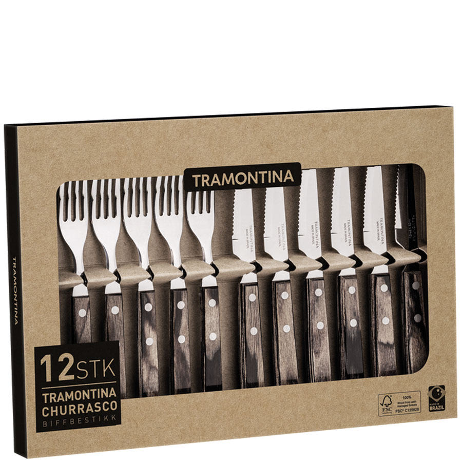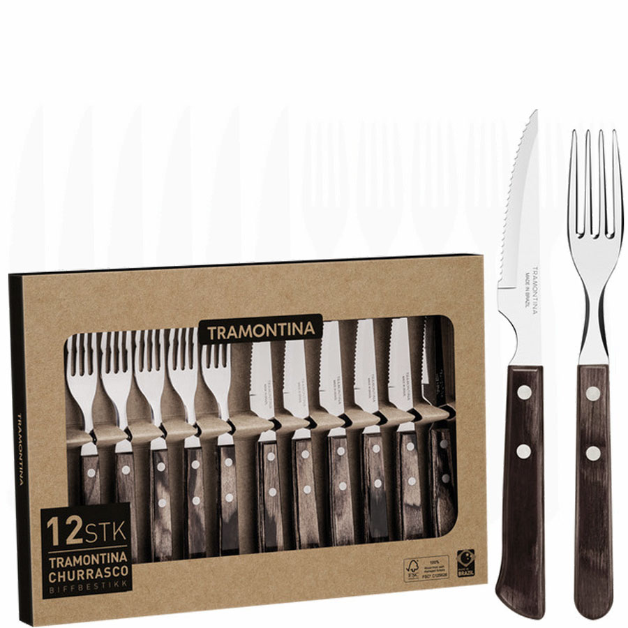 Biffbestick i set om 12 delar i hög kvalitet från Tramontina. Bestickens handtag är tillverkade i polywoodteknik som är ytbehandlat hårt pressat furu. Detta gör att de tål höga temperaturer och att tvättas i diskmaskin. 5 års garanti.