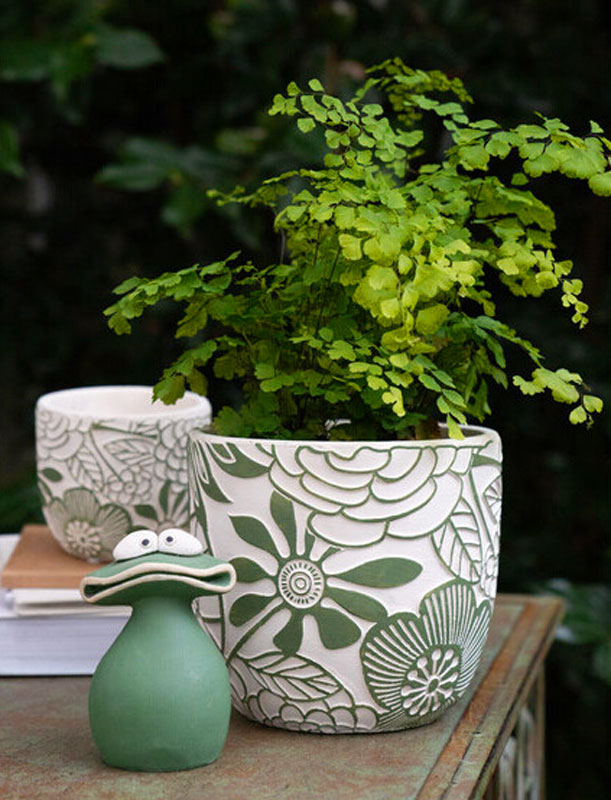 Att införliva blommönstrade blomkrukor i din inredning kan ge en känsla av delikatess och romantik till din styling. Spring-serien har en lekfull grön glasyr och kommer i olika former och storlekar.