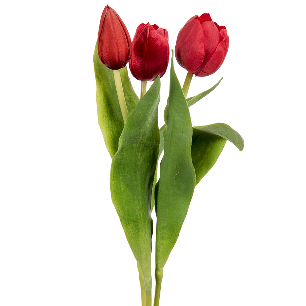 3 St konstgjorda röda färgade tulpaner i väldigt verklighetstroget utförande från Mr.Plant. T o m bladen känns sådär frasigt verkliga. Dessa säljs mixade 3st där varje tulpan är olika utslagen. Köper du 1st får du alltså 3st - 1 i knopp, 1 utslagen och 1 mittemellan - se bild. Köper du 2st får du 6st osv...