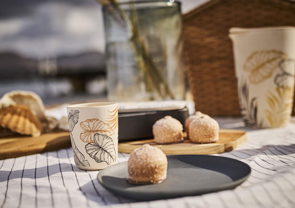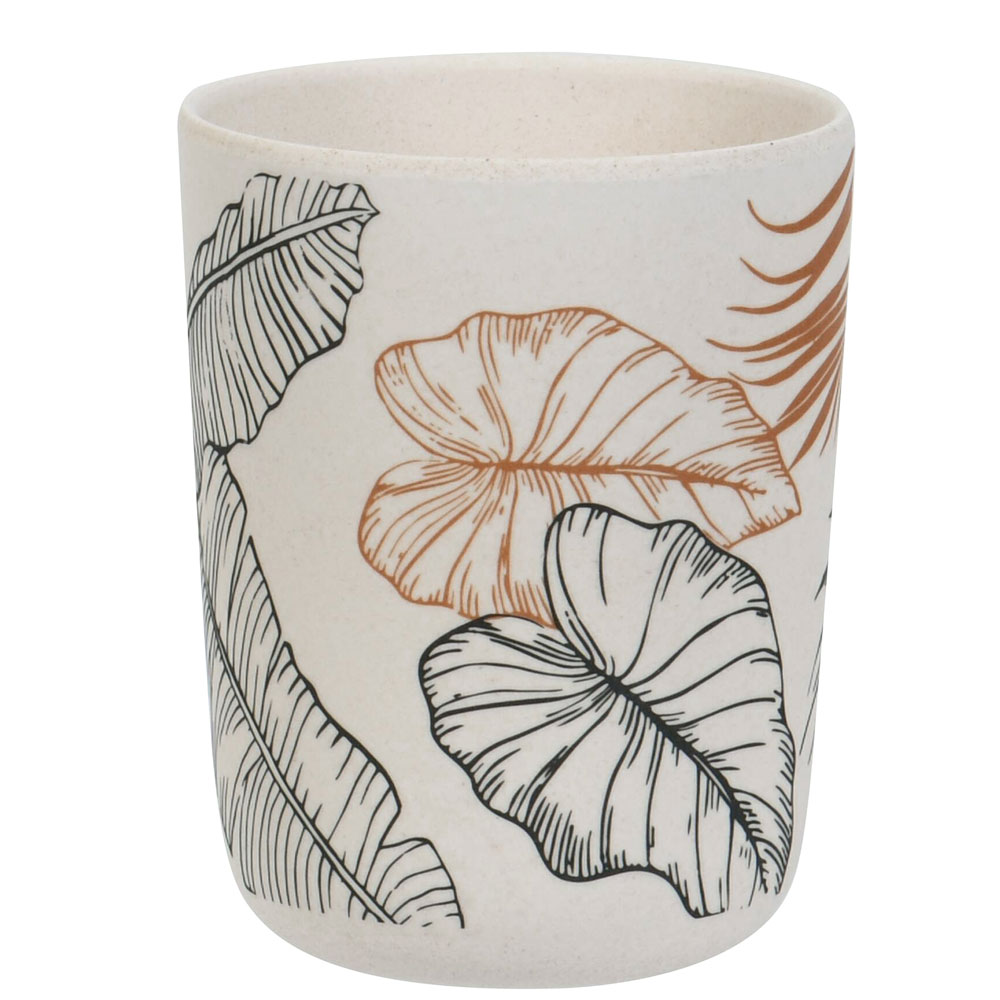 Muggar, bägare i PLA med vackert lövmönster i orange (viss koppar-ton) och svart.