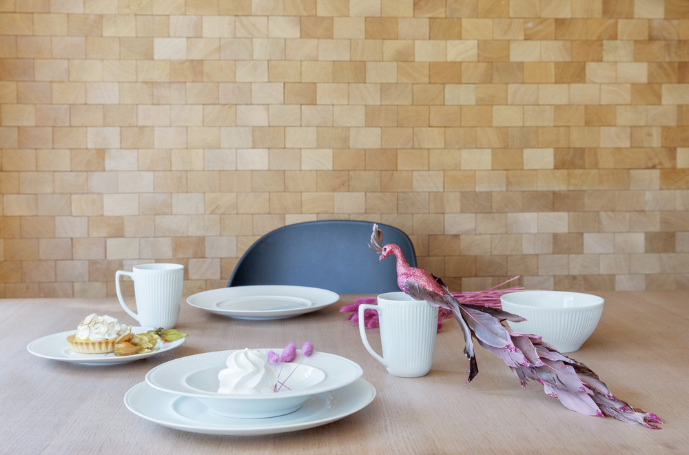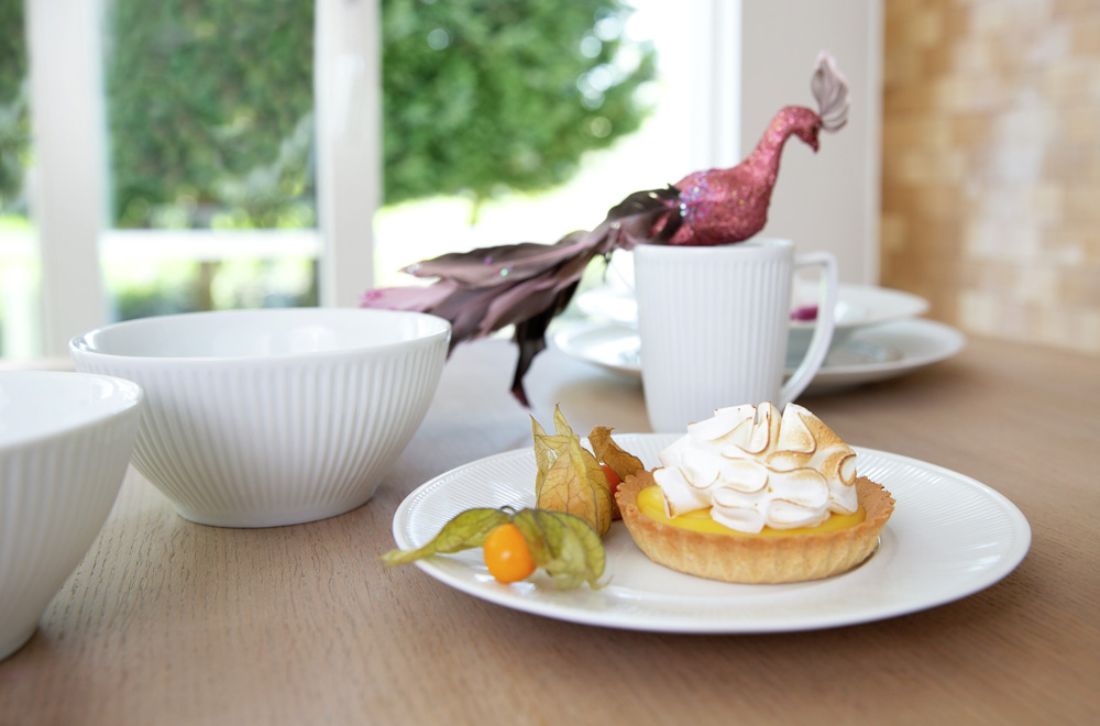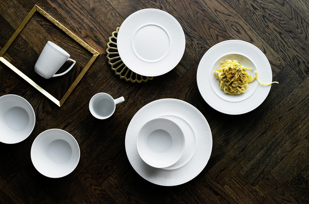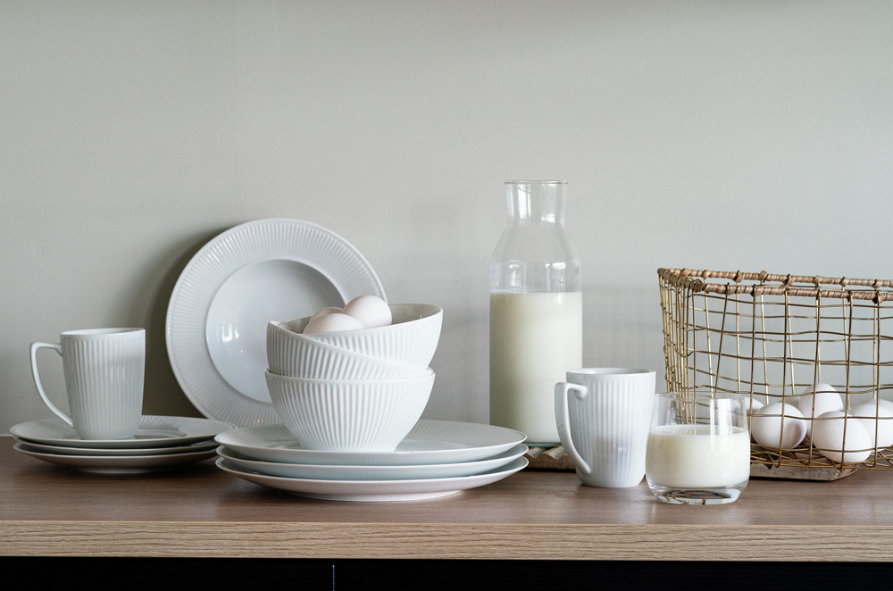 Mugg till kaffe eller te i serien "Contour" - Vit porslin i klassisk tidlös design från Modern House. Contour har en vackert randig struktur i porslinet. Serien innehåller flera vackra delar.