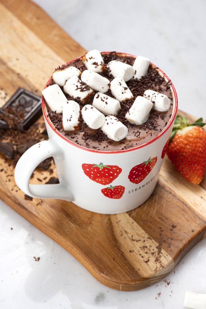 Konstnärligt vacker vit mugg med kraftfullt röda vackra jordgubbar.