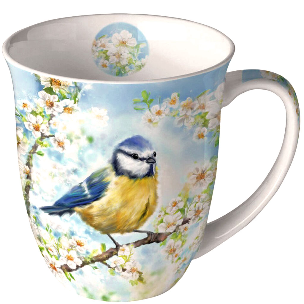 Konstnärligt vacker mugg i fint benporslin - Vackert vårmotiv med färggrann blåmes i blommande fruktträd. Tillverkas av Ambiente kända för sina otroligt vackra designmotiv