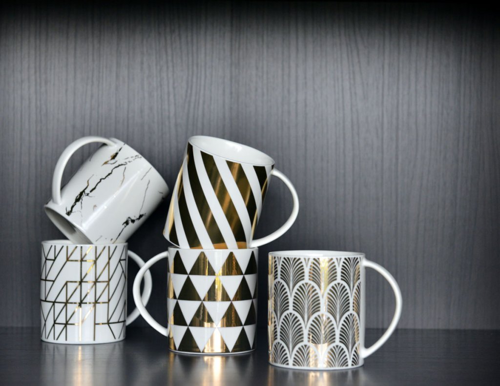 Vit mugg i porslin med guldmönster - Spiral