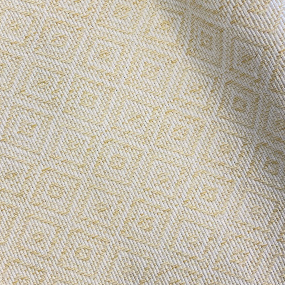Vit bordslöpare "Lyngby" i 100% bomull, med mönster i beige, ljusgul. Bottenväven i löparen är vit, offwhite och mönster upplevs som ljus beige.
