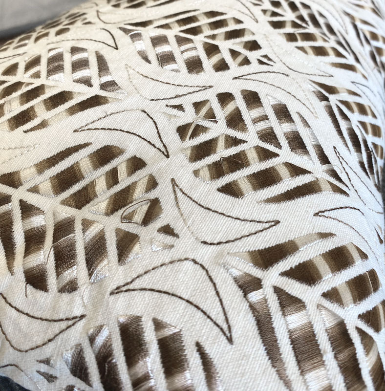 Mycket vacker avlång kudde i ljus beige/naturfärgad med maskinvävt/broderat brunt mönster med hög glansighet. Innerkudde med fjädrar ingår.