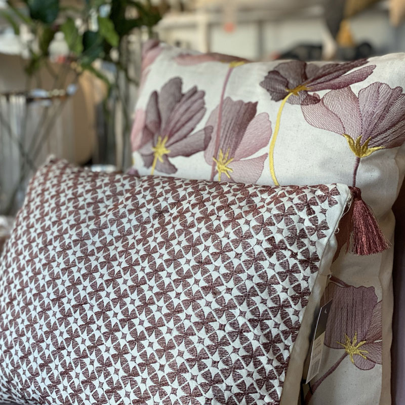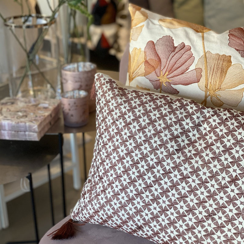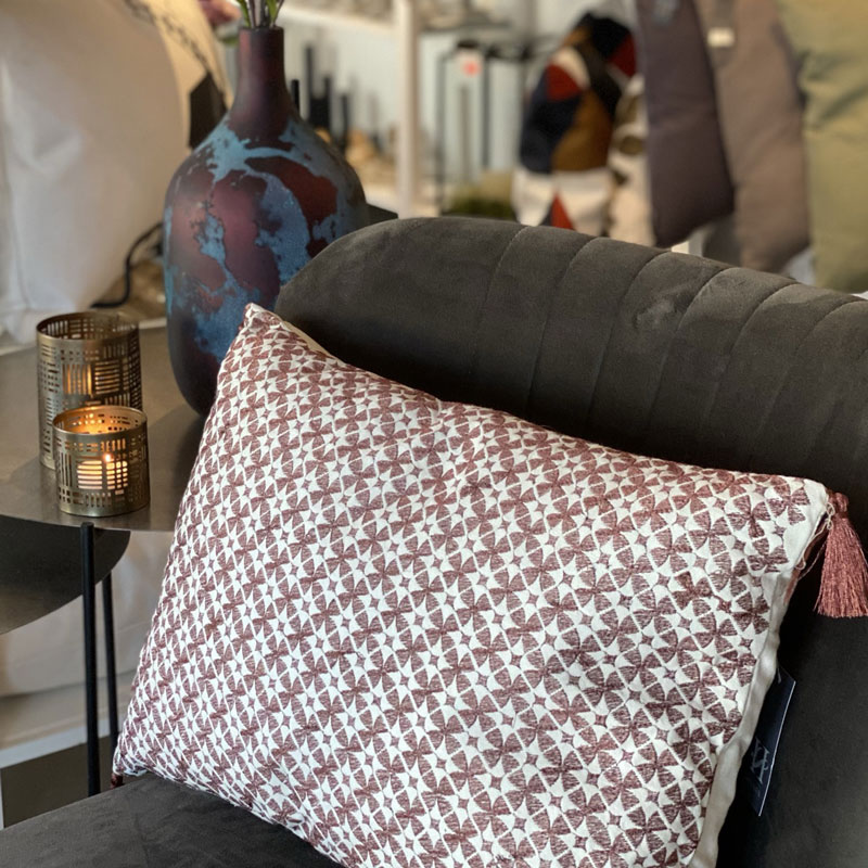 Mycket fin avlång kudde med maskinvävt/broderat mönster med hög glansighet. Mönster i en blandning av rost och mörk kopparfärg. Tofsar i hörnen och också de med glansiga trådar i samma färg som mönstret på framsidan av kudden. Innerkudde med fjädrar ingår.