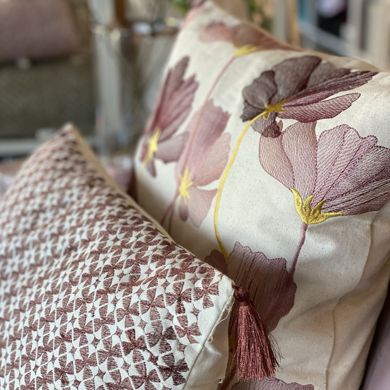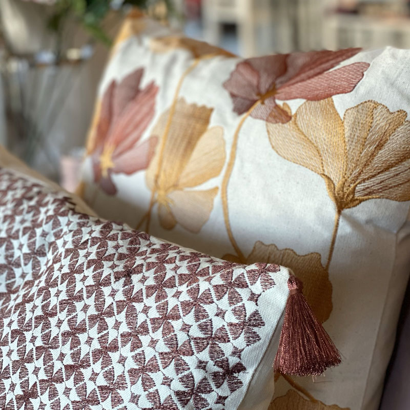 Naturfärgad avlång kudde med mörkt kopparfärgat brodyrmönster och tofsar - Innerkudde med fjädrar ingår